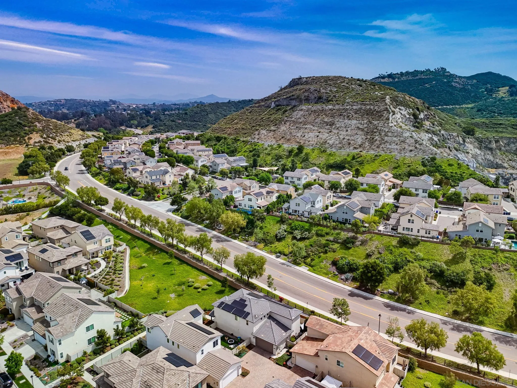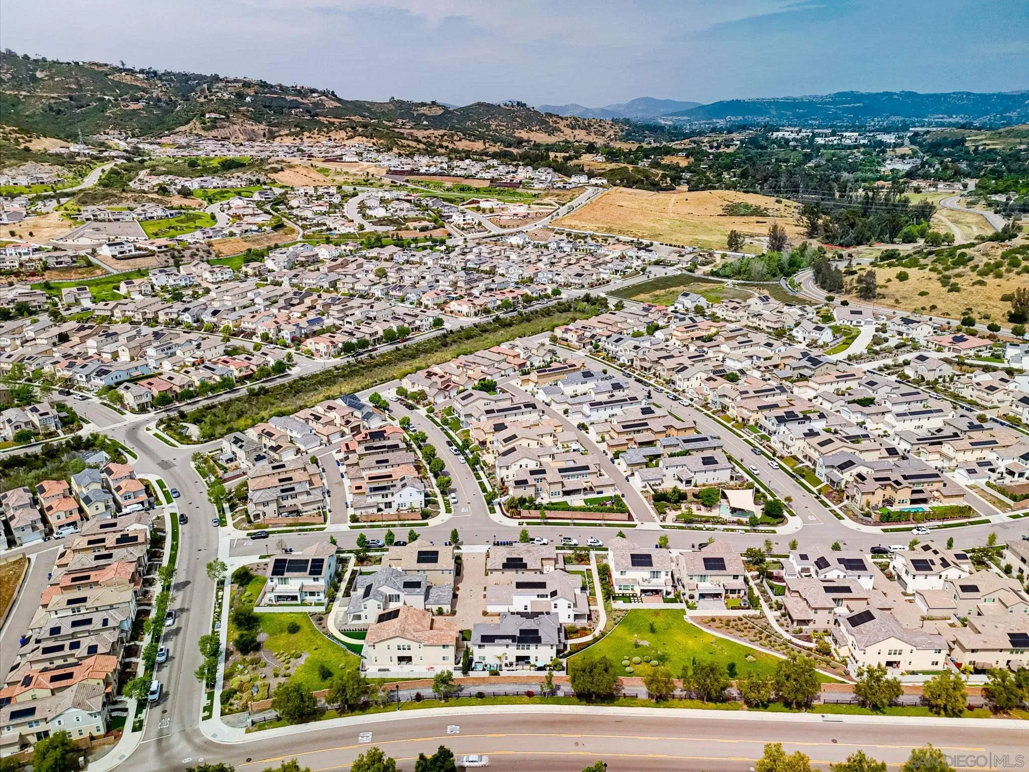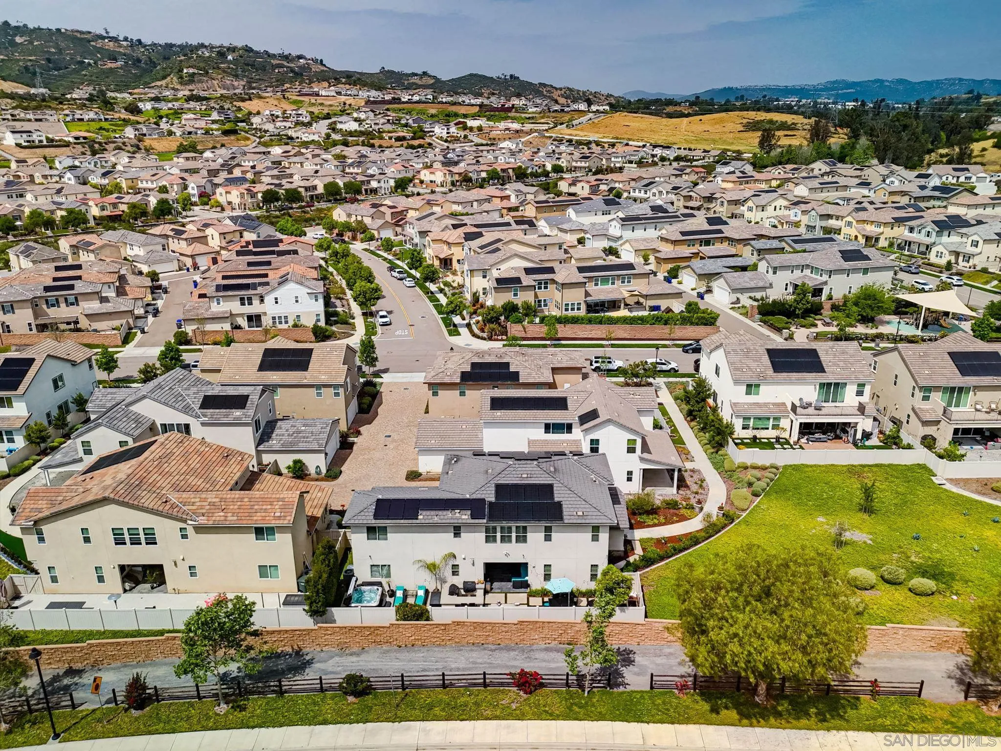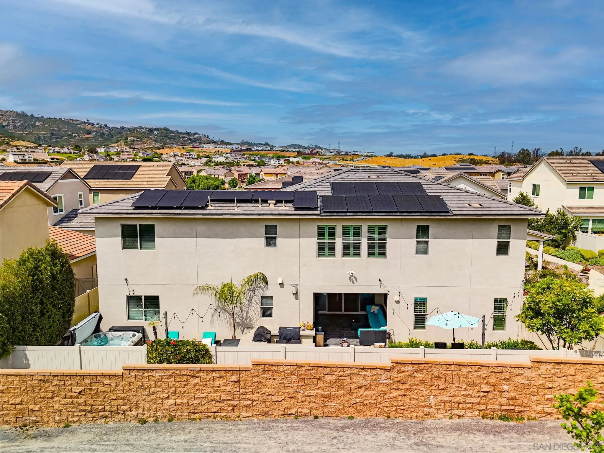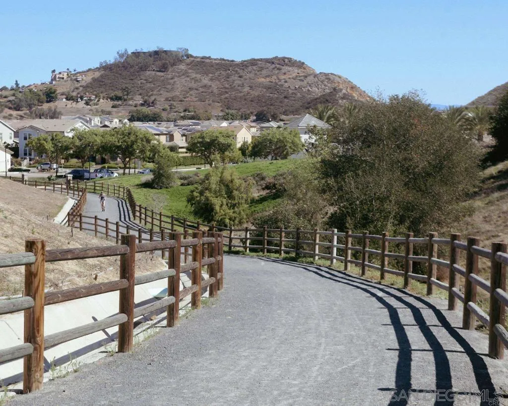 Beautifully maintained 4-bedroom, 3-bath residence tucked away in a private Harmony Grove setting, offering serene open-space & lush greenery views. Over $130,000 in seller upgrades. Thoughtfully landscaped entry & welcoming pathway set the tone for the home's inviting interior. Built in 2019, this highly sought-after open-concept floor plan seamlessly blends comfort & functionality--ideal for both everyday living and effortless entertaining. The expansive kitchen serves as the heart of the home, featuring a large quartz island, stainless steel appliances, a pantry closet, abundant cabinetry, a breakfast bar & a dedicated dining area. The kitchen flows into the spacious living room & extends to a covered California room, creating a true indoor-outdoor living experience. The entertainer's backyard is fully finished w/ a built-in barbecue, water feature, hot tub, & multiple seating areas--all with no neighbors behind, offering exceptional privacy. A downstairs bedroom & full bath provide versatile living options, perfect for guests, a home office, gym, or multi-generational living. The flexible floorplan continues upstairs with an open loft space, 2 additional bedrooms, full hallway bathroom & the primary bedroom & bath. This space showcases a large bedroom filled with light, walk in closet, dual sinks in the bathroom & a separate soaking tub/shower. Additional features include AC, 28 owned solar panels & community pool, parks & walking trails. Turnkey, private, & thoughtfully designed for modern living, this Harmony Grove home truly checks every box.