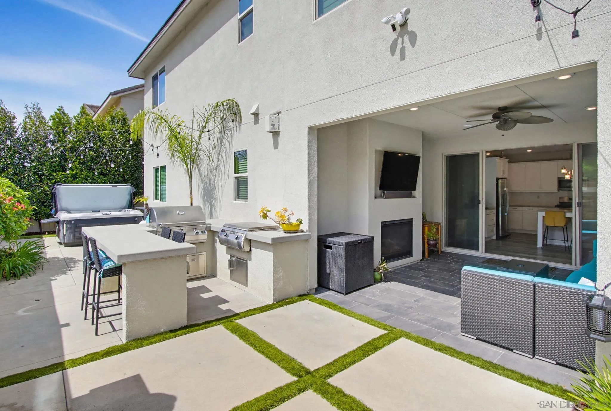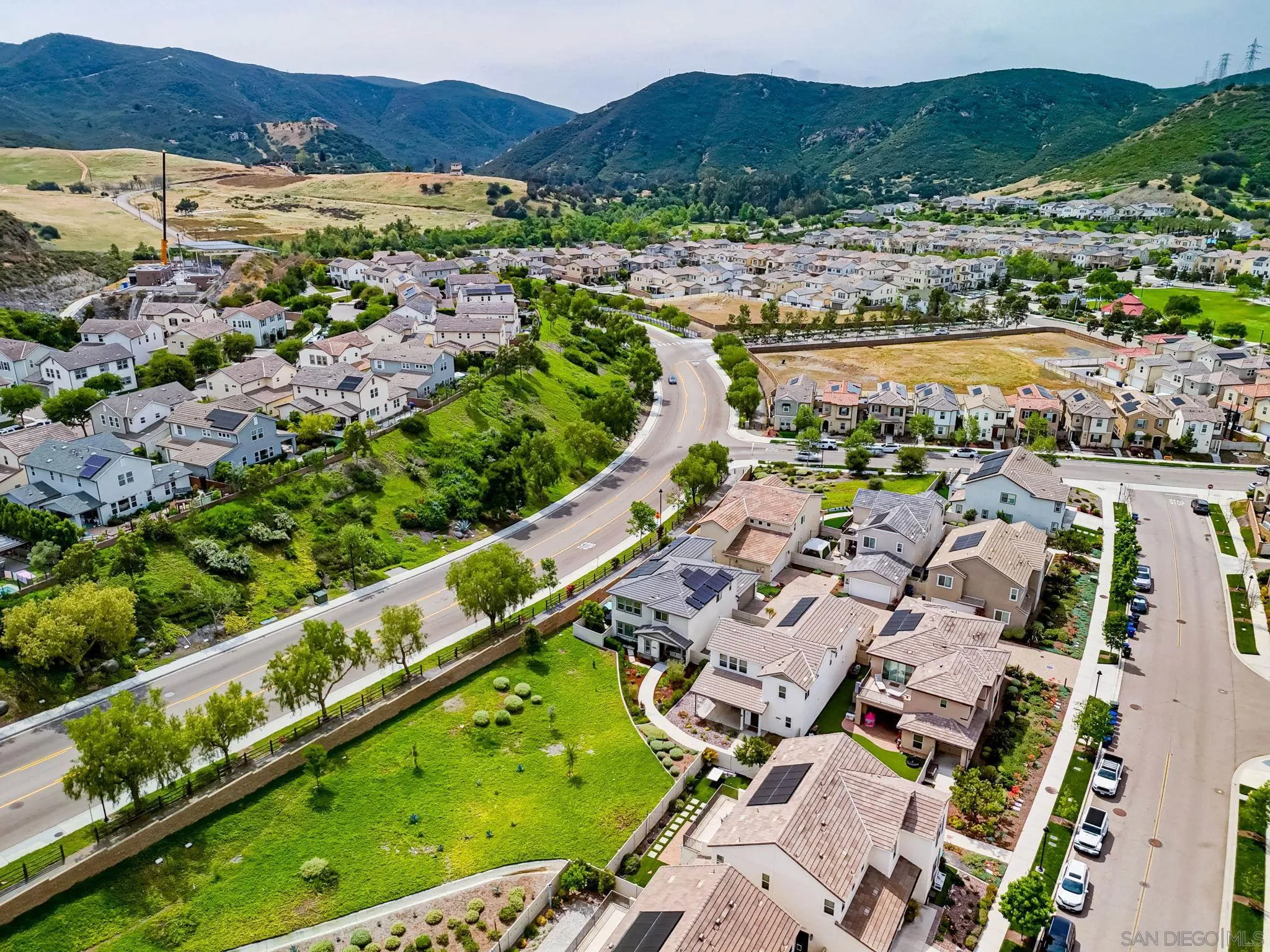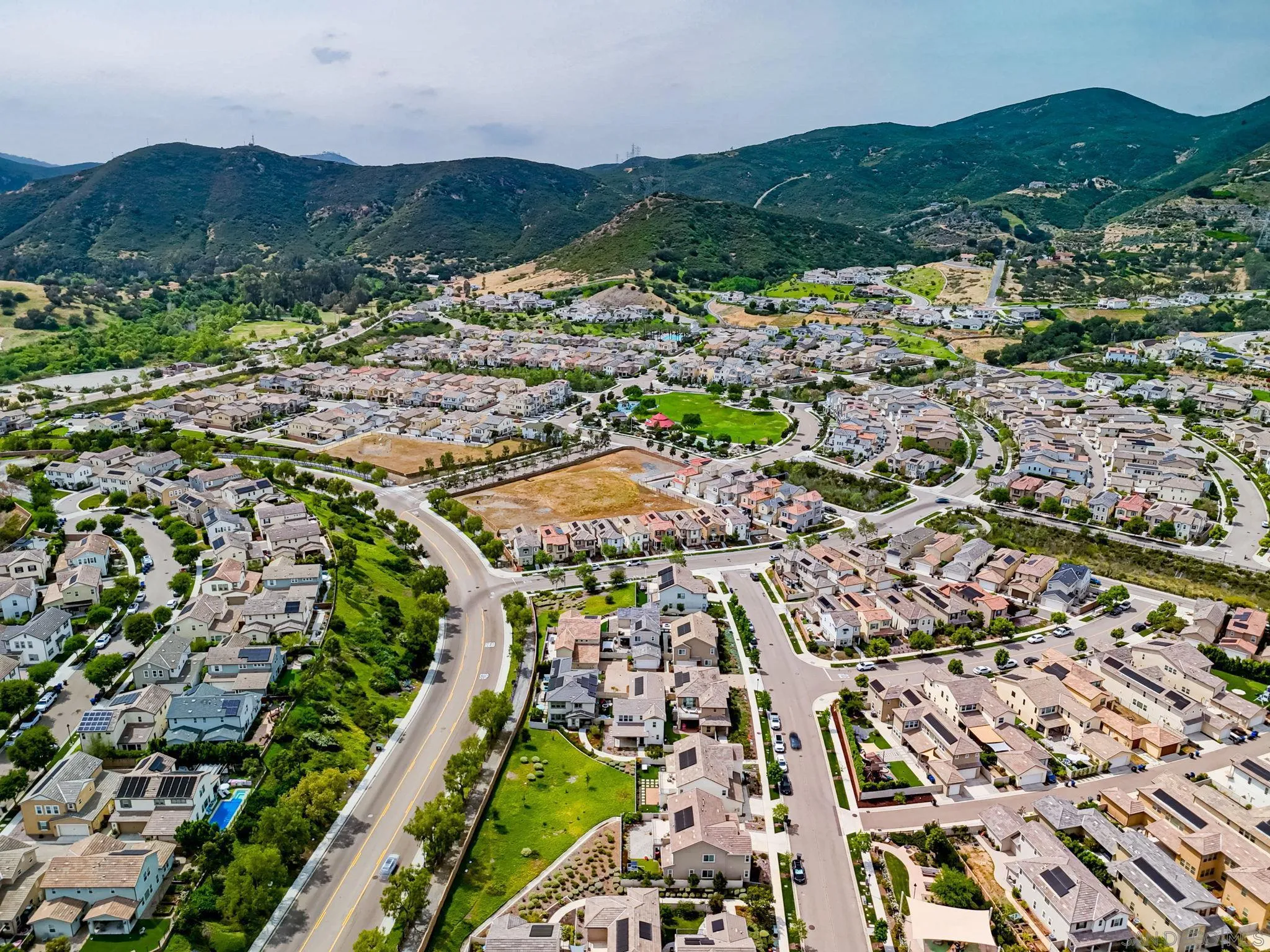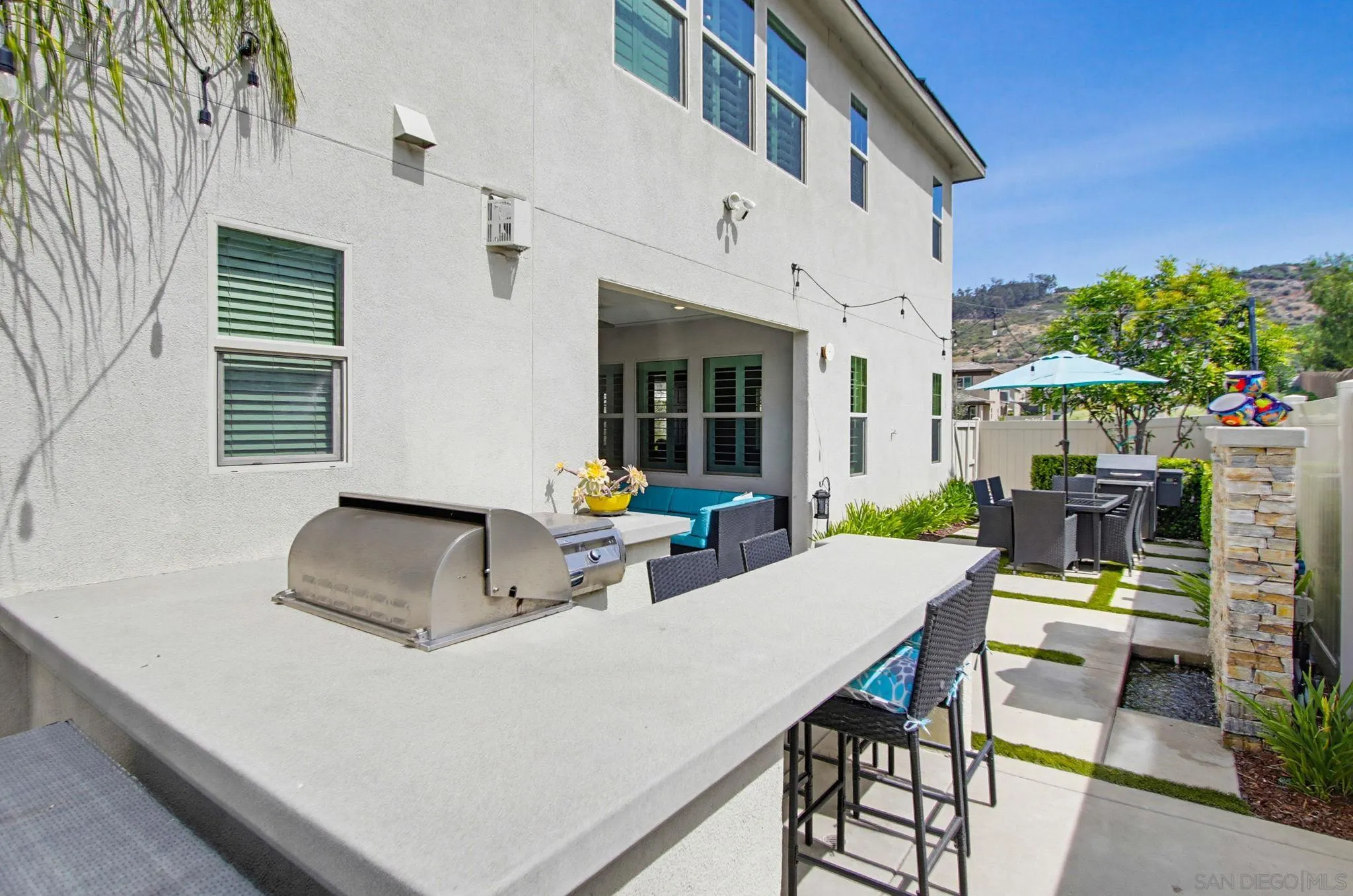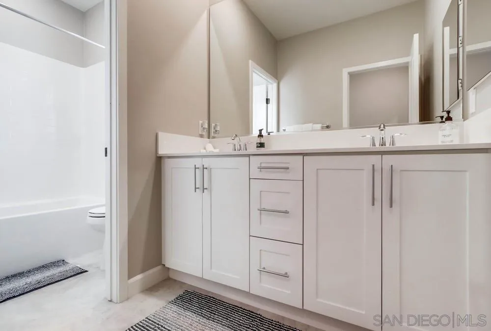 Beautifully maintained 4-bedroom, 3-bath residence tucked away in a private Harmony Grove setting, offering serene open-space & lush greenery views. Over $130,000 in seller upgrades. Thoughtfully landscaped entry & welcoming pathway set the tone for the home's inviting interior. Built in 2019, this highly sought-after open-concept floor plan seamlessly blends comfort & functionality--ideal for both everyday living and effortless entertaining. The expansive kitchen serves as the heart of the home, featuring a large quartz island, stainless steel appliances, a pantry closet, abundant cabinetry, a breakfast bar & a dedicated dining area. The kitchen flows into the spacious living room & extends to a covered California room, creating a true indoor-outdoor living experience. The entertainer's backyard is fully finished w/ a built-in barbecue, water feature, hot tub, & multiple seating areas--all with no neighbors behind, offering exceptional privacy. A downstairs bedroom & full bath provide versatile living options, perfect for guests, a home office, gym, or multi-generational living. The flexible floorplan continues upstairs with an open loft space, 2 additional bedrooms, full hallway bathroom & the primary bedroom & bath. This space showcases a large bedroom filled with light, walk in closet, dual sinks in the bathroom & a separate soaking tub/shower. Additional features include AC, 28 owned solar panels & community pool, parks & walking trails. Turnkey, private, & thoughtfully designed for modern living, this Harmony Grove home truly checks every box.