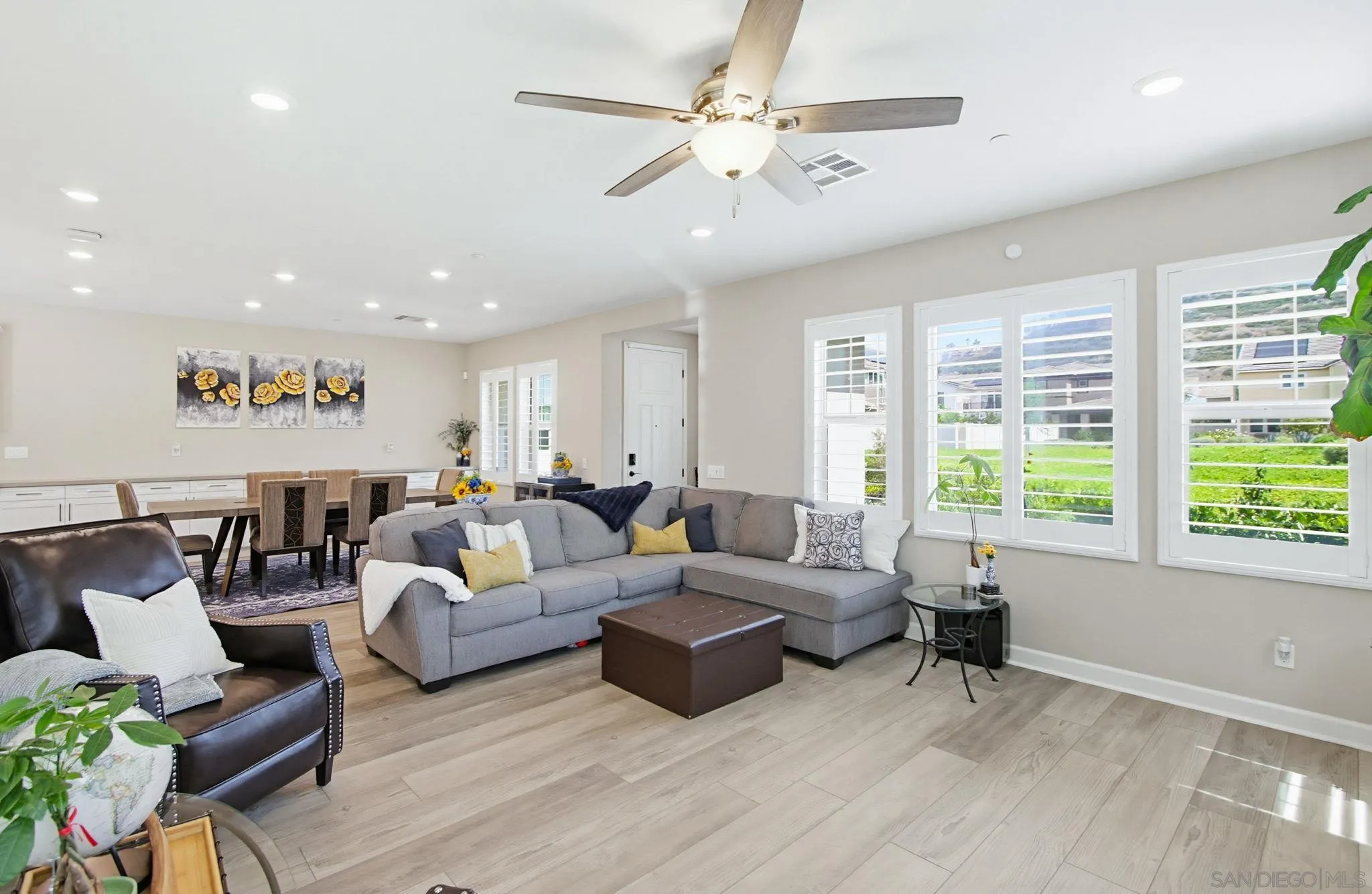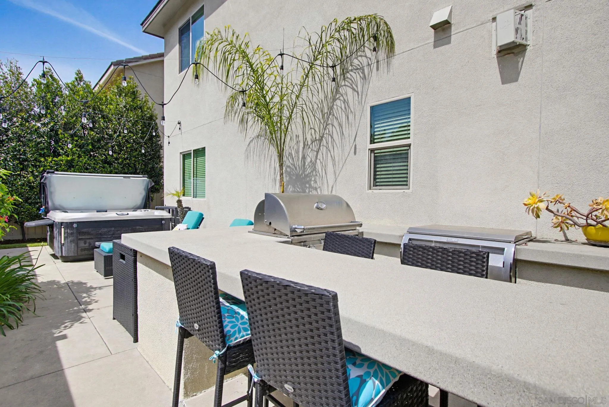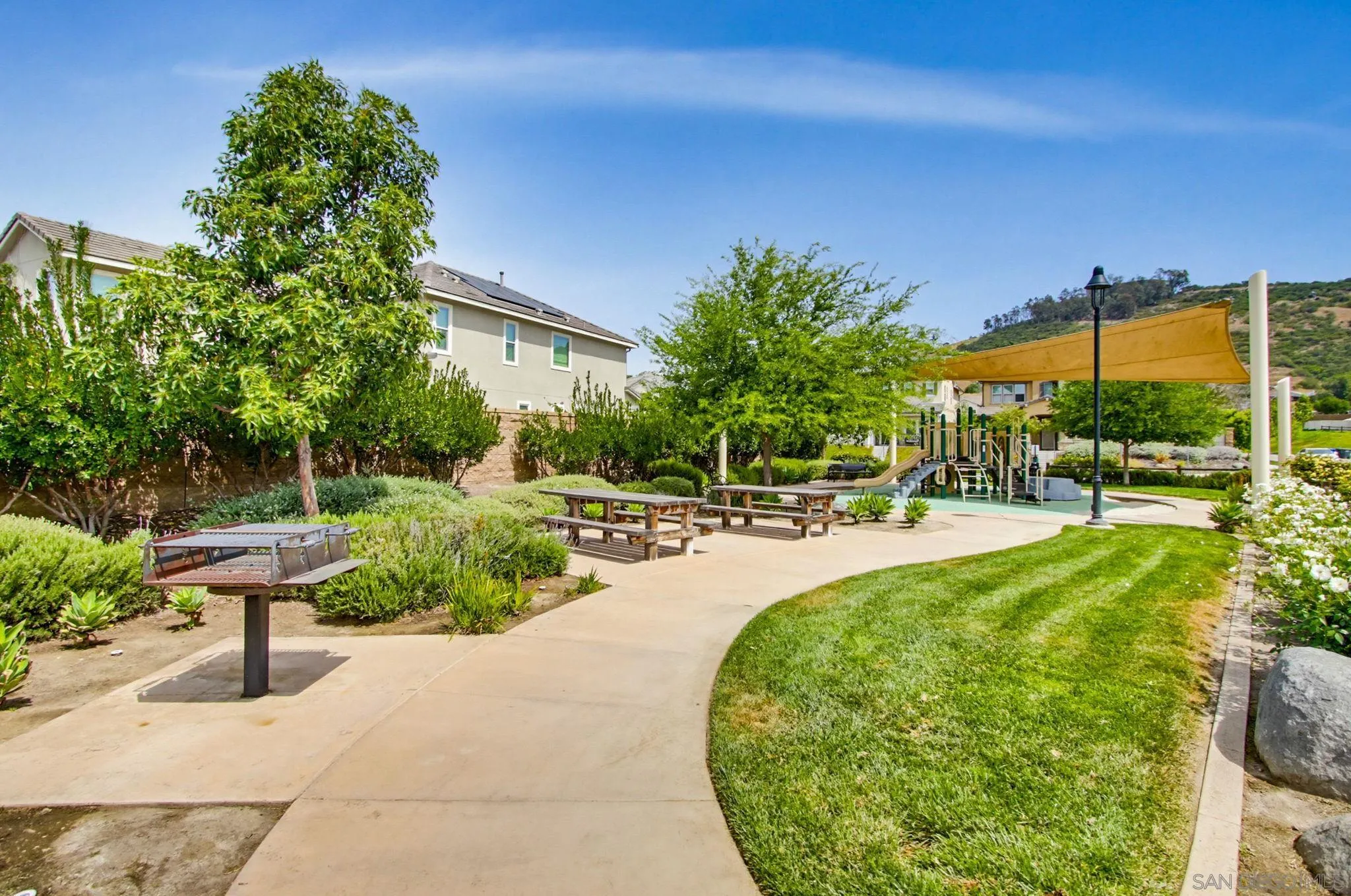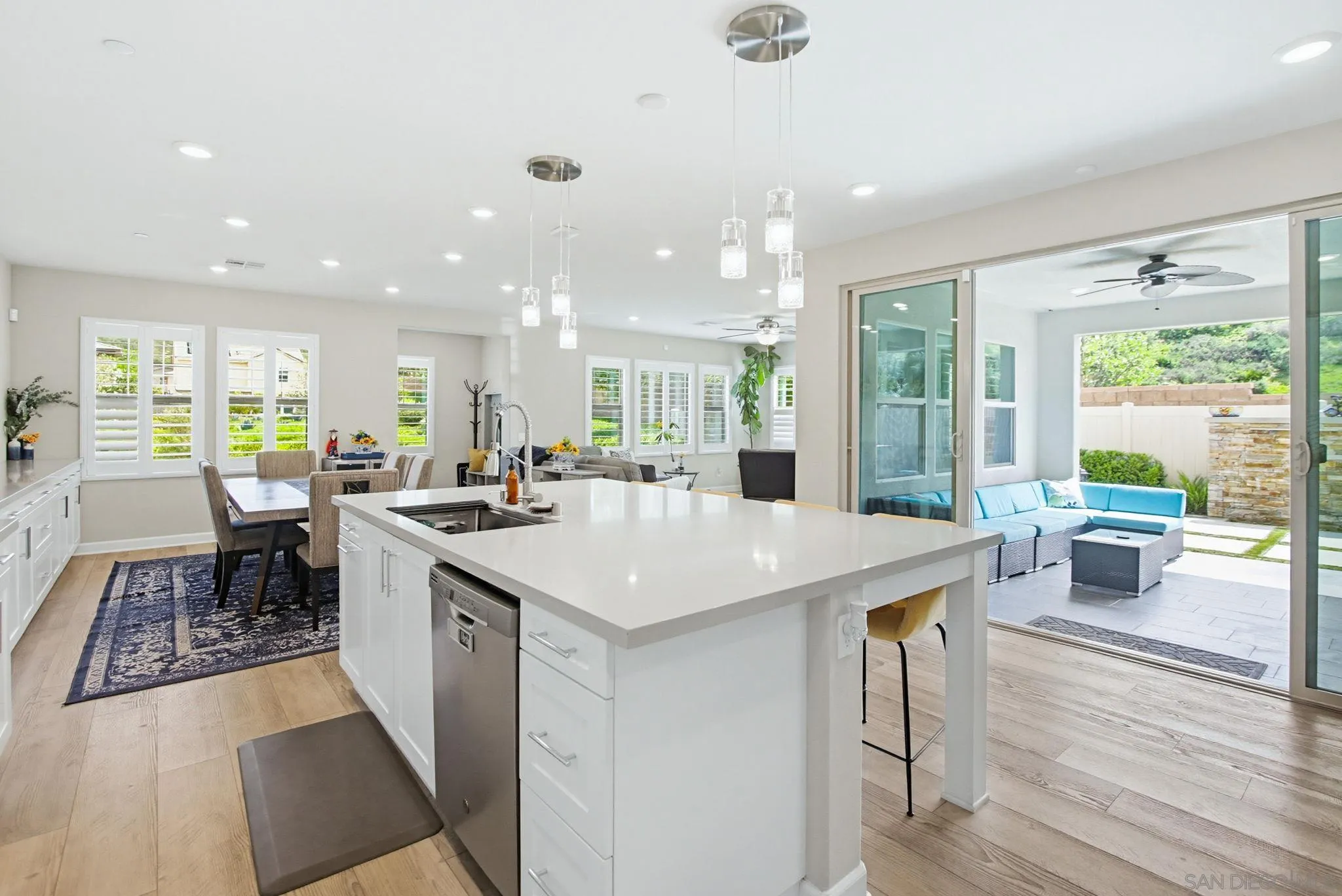 Beautifully maintained 4-bedroom, 3-bath residence tucked away in a private Harmony Grove setting, offering serene open-space & lush greenery views. Over $130,000 in seller upgrades. Thoughtfully landscaped entry & welcoming pathway set the tone for the home's inviting interior. Built in 2019, this highly sought-after open-concept floor plan seamlessly blends comfort & functionality--ideal for both everyday living and effortless entertaining. The expansive kitchen serves as the heart of the home, featuring a large quartz island, stainless steel appliances, a pantry closet, abundant cabinetry, a breakfast bar & a dedicated dining area. The kitchen flows into the spacious living room & extends to a covered California room, creating a true indoor-outdoor living experience. The entertainer's backyard is fully finished w/ a built-in barbecue, water feature, hot tub, & multiple seating areas--all with no neighbors behind, offering exceptional privacy. A downstairs bedroom & full bath provide versatile living options, perfect for guests, a home office, gym, or multi-generational living. The flexible floorplan continues upstairs with an open loft space, 2 additional bedrooms, full hallway bathroom & the primary bedroom & bath. This space showcases a large bedroom filled with light, walk in closet, dual sinks in the bathroom & a separate soaking tub/shower. Additional features include AC, 28 owned solar panels & community pool, parks & walking trails. Turnkey, private, & thoughtfully designed for modern living, this Harmony Grove home truly checks every box.